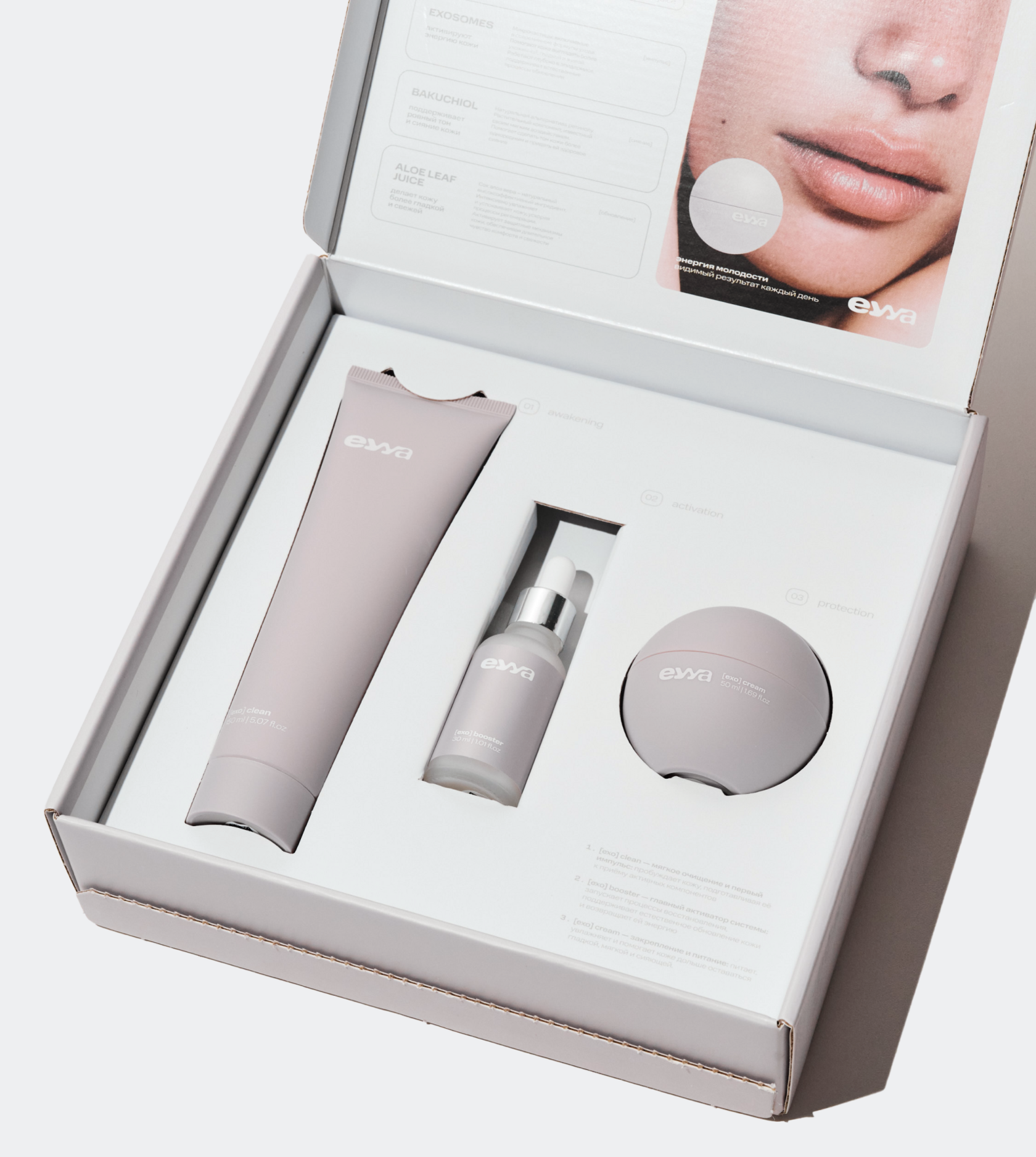Для достижения «вау» эффекта на вашей коже рекомендуем использовать полноценную систему ухода — [exo] system box.